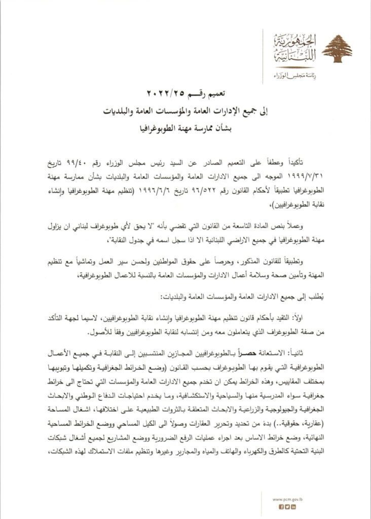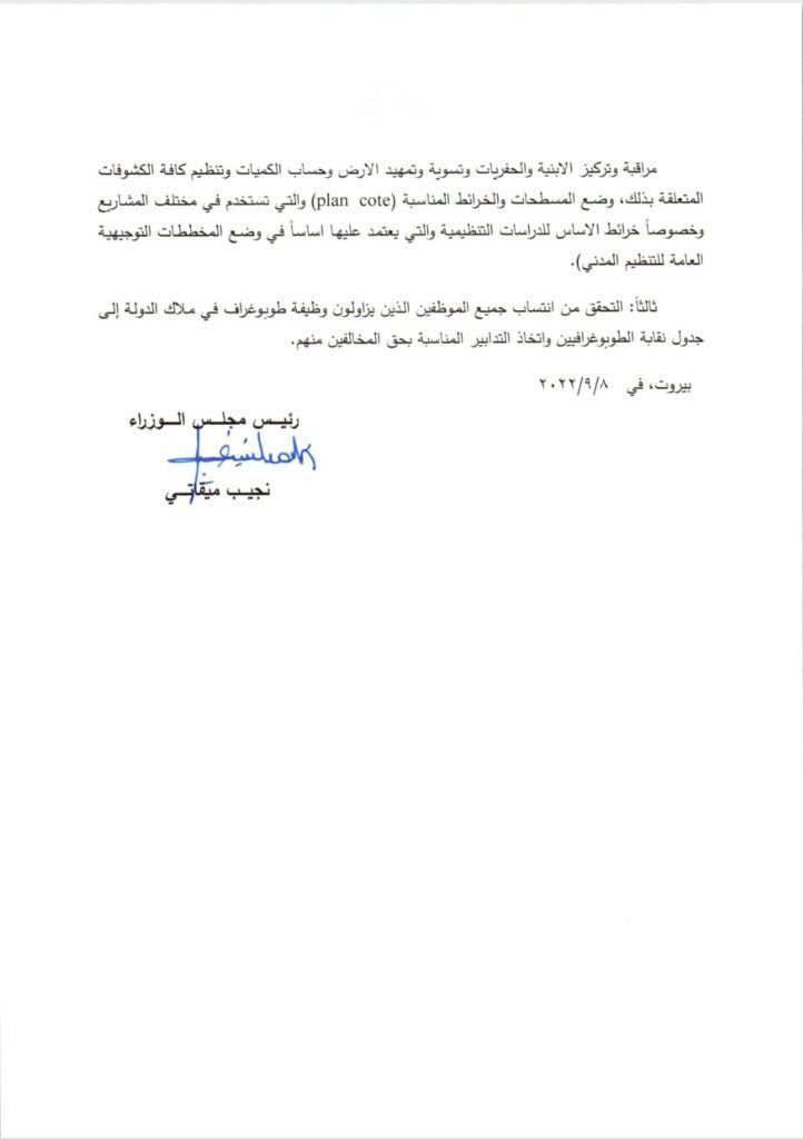 وجّه رئيس الحكومة نجيب ميقاتي تعميما الى جميع المؤسسات العامة والادارات العامة والبلديات بشان ممارسة مهنة الطوبوغرافيا جاء فيها: