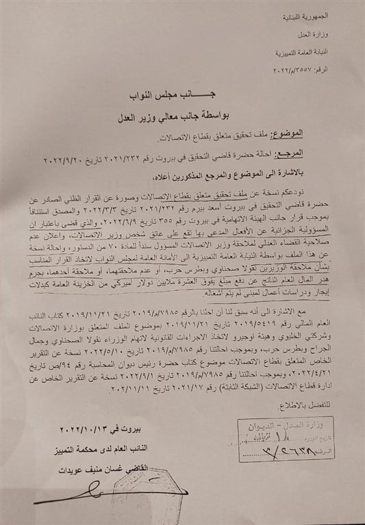بحثت هيئة مكتب مجلس النواب ولجنة الادارة والعدل في عين التينة مع رئيس مجلس النواب نبيه برّي في الكتاب الذي أرسله النائب العام لدى محكمة التمييز القاضي غسان عويدات الى مجلس النواب عبر وزير العدل في حكومة تصريف الأعمال هنري خوري والذي يتعلّق بهدر المال العام في قطاع الاتصالات.