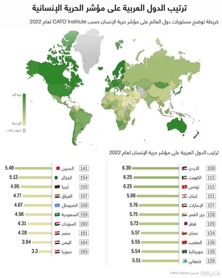 بالصورة: ترتيب الدول العربية على مؤشر الحرية الإنسانية.. ماذا عن لبنان؟