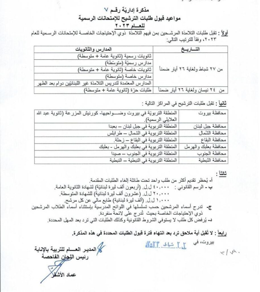 أصدرت وزارة التربية مذكرة إداريّة بشأن مواعيد قبول طلبات الترشيح للإمتحانات الرسمية للعام 2023 وجاء فيها الآتي: