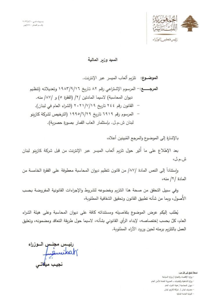 وجه رئيس حكومة تصريف الاعمال نجيب ميقاتي كتابا الى وزير المالية يوسف الخليل، حول تلزيم أسعار الميسر عبر الانترنت.