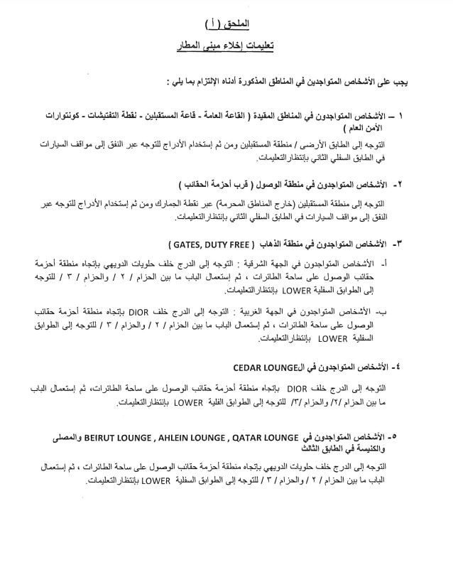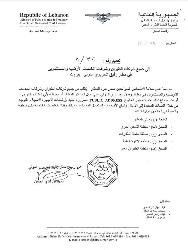 صدر عن رئاسة مطار بيروت، تعميما يحوي إرشادات وتعليمات للمسافرين لإخلاء مبنى مطار رفيق الحريري الدولي في حالة الطوارئ.