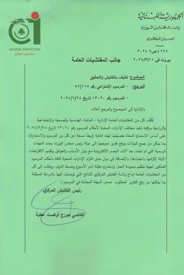 أصدر رئيس التفتيش المركزي القاضي جورج عطية تكليفا بالتفتيش لكلّ من المفتشيّات العامة الادارية، المالية، الهندسيّة والصحيّة والاجتماعيّة والزراعيّة الرقم ٢٦٦/ ص٢ ٢٠٢٤، تاريخ ١١/٠٣/٢٠٢٤ ، لمراقبة التزام مختلف الادارات المعنية بتنفيذ أحكام المرسوم الرقم ١٣٠٢٠ تاريخ ٢٨/٠٢/٢٠٢٤، ولتحديد الجهات الرسمية التي لم تعتمد بعد آلات البصم الالكترونية مع بيان الاسباب والعوائق وتقديم الاقتراحات الآيلة لالزامها باعتمادها، بالاضافة الى بيان مدى التزام الادارات المعنية بتنظيم ديمومة العمل واستمراره طيلة ايام الاسبوع وضبط الدوام والحضور، على أن تودع المفتشيات العامة المشار اليها رئاسة التفتيش المركزي النتائج التي تتوصل اليها بالسرعة الممكنة بما يمكّنها من جمع البيانات ورفع تقرير بموجبها الى دولة رئيس مجلس الوزراء.