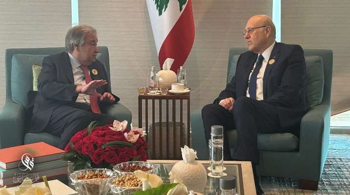 كما ناشد ميقاتي غوتيريش لـ “الضّغط على إسرائيل لوقف عدوانها على جنوب لبنان وغزة، والانطلاق في معالجة الوضع في جنوب لبنان”.
