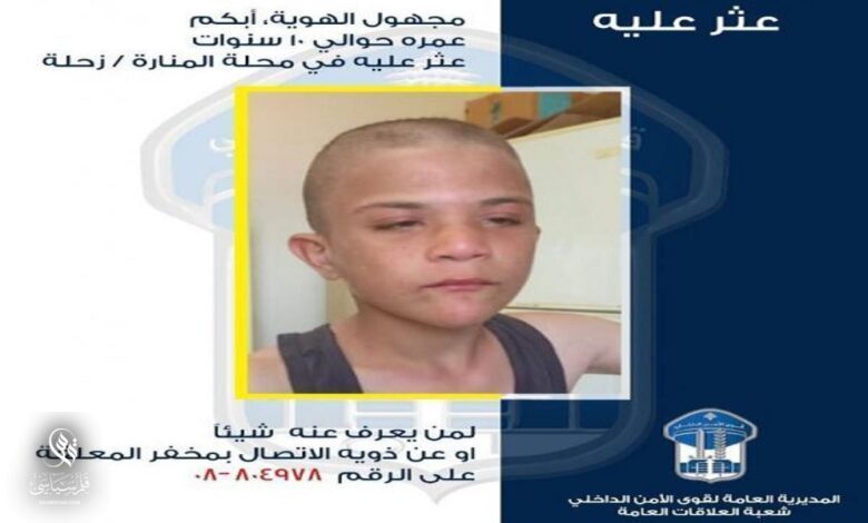 عمّمت المديرية العامة لقوى الأمن الداخلي، بناءً على إشارة القضاء المختص، صورة طفل عمره حوالى /10/ سنوات مجهول الهوية عثر عليه بتاريخ 1-6-2024 في محلة المنارة / زحلة، وهو أبكم، وليس بحوزته أي مستند يعرّف عنه.