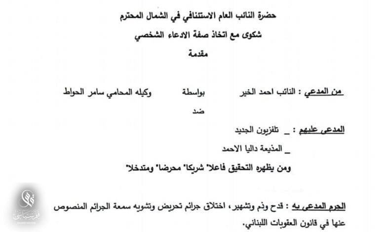 تقدم المحامي سامر الحواط، بوكالته عن عضو تكتل “الاعتدال الوطني” النائب أحمد الخير، بدعوى على تلفزيون “الجديد” والإعلامية داليا الأحمد، أمام النيابة العامة الاستئنافية في الشمال، بجرم “القدح والذم والتشهير واختلاق جرائم تحريض وتشوية سمعة”، اتخذ فيها صفة الادعاء الشخصي، بعد ما بثه برنامج “فشة خلق”، الذي تقدمه الأحمد، مساء الخميس في 6 حزيران 2024، من افتراءات كاذبة واتهامات باطلة وأخبار ملفقة مجافية للحقيقة عن “تدخلات سياسية وضغوط أجراها النائب الخير لطمس الحقيقة وإخفاء أدلة في قضية الطفلة لين طالب التي هزت الرأي العام اللبناني”.