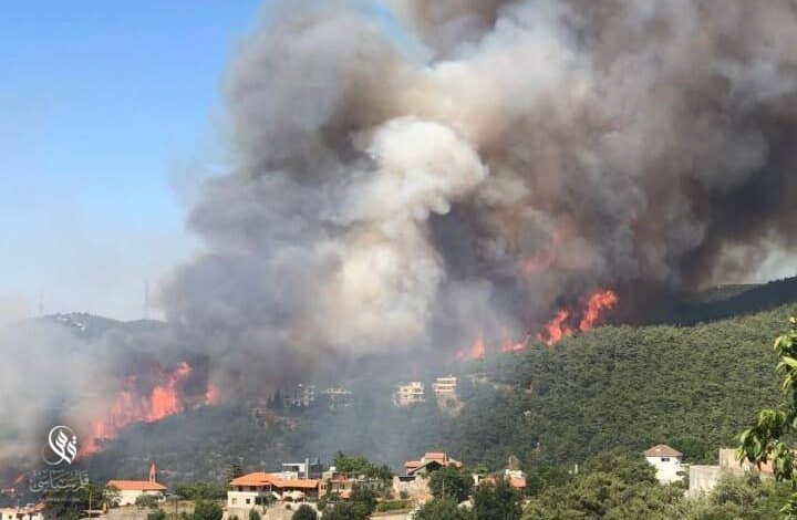 وقد ساهمت الرياح والحرارة في اتساع رقعتها ، وتدخلت عناصر الدفاع المدني في محاولة للسيطرة على الحريق.