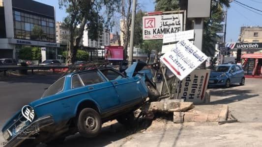 إصطدام سيارة بعامود إنارة على أوتوستراد الدورة