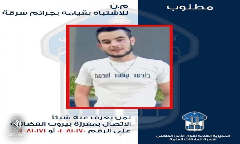 عمّمت المديرية العامة لقوى الأمن الداخلي، بناءً على إشارة القضاء المختص، صورة المطلوب: