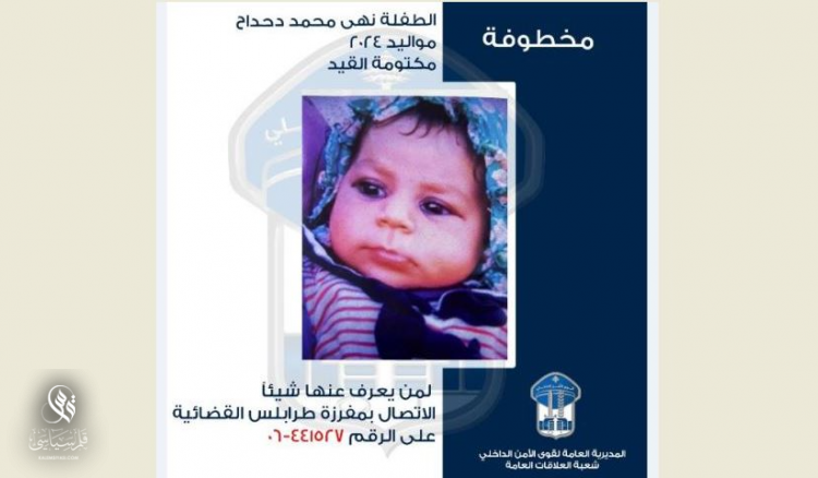 صــدر عــــن المديريّـة العـامّـة لقــوى الأمــن الـدّاخلي ـ شعبة العـلاقـات العـامّـة البــــــلاغ التّالــــــي: “تُعمّم المديريّة العامّة لقوى الأمن الدّاخلي، بناءً على إشارة القضاء المختص، صورة الطّفلة الرضيعة: نهى محمد دحداح (من مواليد عام 2024، مكتومة القيد)، التي اختُطِفَت من والدتها بتاريخ 20-5-2024 بطريقة احتياليّة من قبِل مجهولين، خلال قيامها بالتّسوّل في محلّة العبدة (التّحقيق جارٍ بالحادثة).