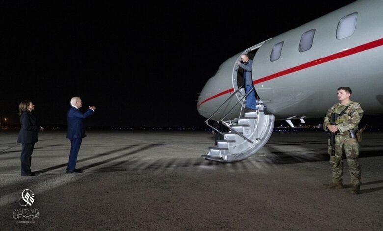 وكان بايدن ونائبته كامالا هاريس في استقبال السجناء الأميركيين الذين أفرجت عنهم روسيا بمراسيم وقعها الرئيس الروسي فلاديمير بوتين، مقابل إطلاق سراح مواطنين روس كانوا في السجون الأميركية.