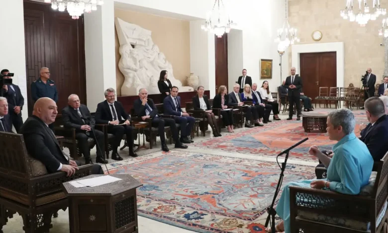 كما بدا لافتاً “الحضور” الأوروبي أمس في المشهد اللبناني عبر لقاء واسع في قصر بعبدا بين رئيس الجمهورية ووفد أوروبي وسفراء الاتحاد الأوروبي. وفي كلمته أمام الوفد، طالب الرئيس عون الاتحاد الأوروبي بدعم لبنان في استعادة كامل أراضيه وبسط سيادة الدولة اللبنانية عليها، بما يشمل كل المناطق من دون استثناء، وذلك عبر إطلاق مبادرة شاملة لدعم الجيش اللبناني، بما يملكه من دور أساسي في حفظ الأمن والاستقرار، وتزويده بكل الوسائل اللوجستية والتقنية والمالية اللازمة. وحذّر من أن “غياب الجيش اللبناني عن بعض المناطق أو إضعاف حضوره قد يؤدي إلى تدهور كبير في الوضع الأمني، ما سينعكس سلبًا ليس فقط على لبنان، بل على استقرار المنطقة بأسرها، وهو أمر لا يرغب به أحد من شركائنا أو من الأسرة الدولية”. ودعا الاتحاد الأوروبي إلى رفع أي عقوبات أوروبية مفروضة على لبنان، والعمل مع الشركاء العرب والدوليين لعقد مؤتمر أوروبي – عربي مخصص لإعادة إعمار لبنان وإنعاش اقتصاده، وذلك بالتوازي مع مسيرته نحو استعادة سيادته الكاملة أمنياً وعسكرياً. أما على صعيد الإصلاحات الاقتصادية، فأكد عون أن “قانون هيكلة المصارف بات في مراحله المتقدمة داخل مجلس النواب، ونأمل بأن يتم إقراره سريعًا مع نهاية الشهر الحالي. كذلك، نعمل ضمن مجموعة مركزة ورفيعة المستوى على وضع اللمسات الأخيرة على قانون الفجوة المالية، كجزء من خطة متكاملة للإنقاذ المالي”.