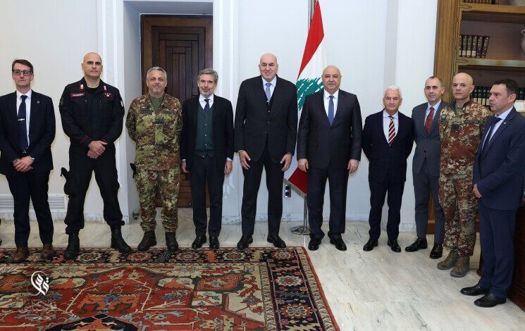 وأبلغ عون وزير الدفاع الإيطالي جويدو كروسيتو خلال استقباله له في القصر الجمهوري، بأنّ لبنان يرحّب بمشاركة إيطاليا ودول أوروبية أخرى في أي قوة تحل محل القوات الدولية العاملة في الجنوب «اليونيفيل» بعد اكتمال انسحابها العام 2027. واكّد «انّ خيار التفاوض الذي اعتمده لبنان هدفه وقف الأعمال العدائية وتحقيق الانسحاب الإسرائيلي وإعادة الأسرى المعتقلين في إسرائيل وإعادة السكان الجنوبيين إلى قراهم وممتلكاتهم، ولبنان ينتظر خطوات إيجابية من الجانب الإسرائيلي، ونعتمد على دول صديقة مثل إيطاليا، للدفع في اتجاه إنجاح العملية التفاوضية والوصول إلى نتائج إيجابية». وقال: «انّ لبنان بلد محب للسلام ولا يريد الحرب، بل يعمل لحفظ الأمن وحماية الحدود وبسط سيادة الدولة»، لافتاً إلى انّ «الجيش هو العمود الفقري لضمان الاستقرار، ليس في لبنان فحسب بل في المنطقة كلها التي تتأثر حكماً بما يكون عليه الواقع الأمني في لبنان». وأشار إلى أهمية توفير الدعم للجيش الذي لا تقتصر مهمّاته على الحدود فقط بل على كل لبنان.