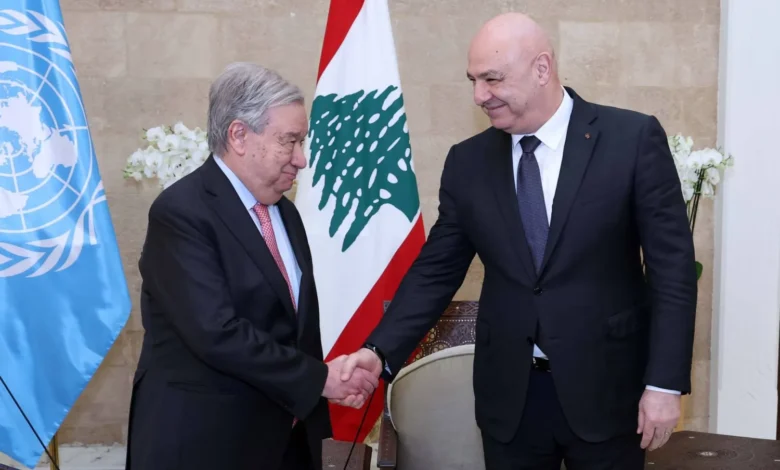 وأضاف أن لبنان أبدى «استعداداً للمفاوضات المباشرة وعلى أعلى المستويات»، لكنه أوضح أنه «لم يتلقَّ حتى الآن أي جواب على هذه المبادرة». ولفت إلى أن نجاح أي مسار تفاوضي يتطلب من إسرائيل «إعطاء شيء في المقابل مثل وقف مؤقت لإطلاق النار لكي نتمكن من إجراء المفاوضات»، متوجهاً إلى غوتيريش بالقول.