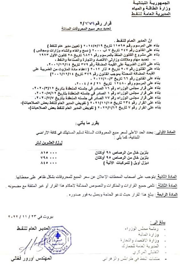 صدر عن وزارة الطاقة والمياه صباح اليوم الأربعاء, جدولٌ جديد للمحروقات، وجاءت الأسعار على الشّكل الآتي: