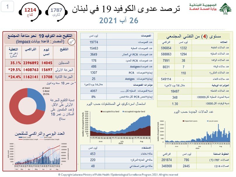 أعلنت وزارة الصحة العامة عن تسجيل 1332 إصابة جديدة بكورونا و7 حالات وفاة.