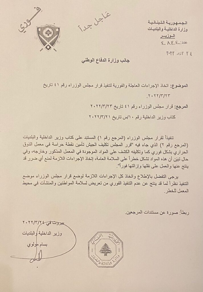 بناءً عليه، أرسل الوزير مولوي كتاباً إلى وزارة الدفاع الوطني يطلب فيه اتخاذ كل الاجراءات اللازمة لوضع قرار مجلس الوزراء موضع التنفيذ نظراً لما قد ينتج عن عدم التنفيذ الفوري من تعريض لسلامة المواطنين والمنشآت في محيط المعمل للخطر، هذا ويؤكد مولوي متابعته لهذه المسألة بشكل دقيق.