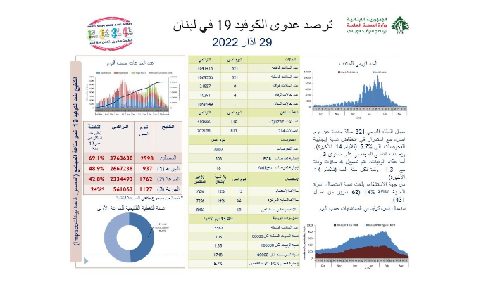 أعلنت وزارة الصحة العامة في تقريرها اليومي تسجيل “321 إصابة جديدة بفيروس كورونا رفعت العدد التراكمي للحالات المثبتة الى 1091413، كما تم تسجيل 4 حالات وفاة”