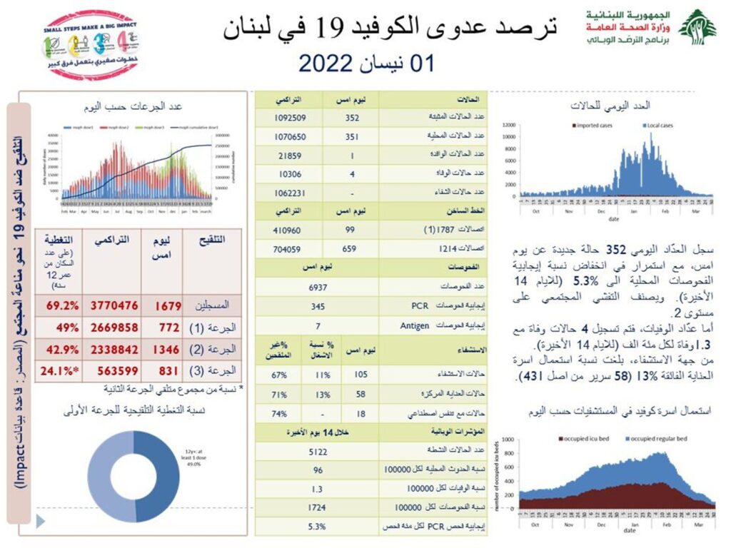 أعلنت وزارة الصحة العامة تسجيل 352 إصابة جديدة بفيروس “كورونا” في لبنان.