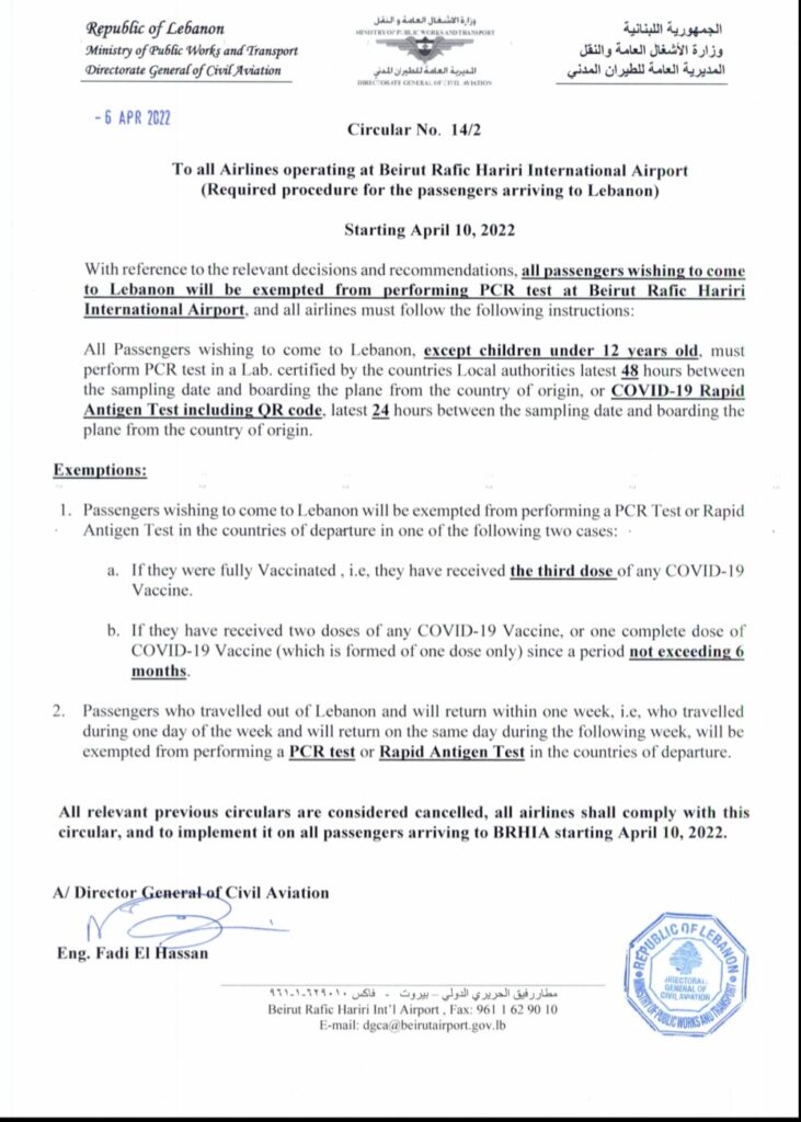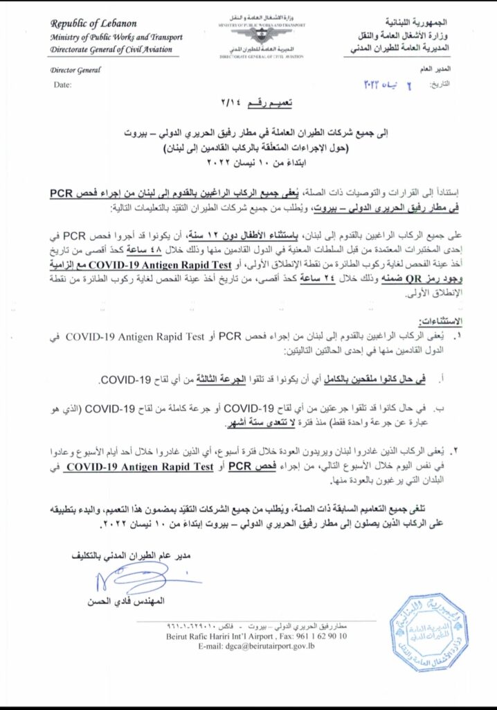 أصدر المدير العام للطيران المدني في مطار رفيق الحريري الدولي فادي الحسن، تعميمًا الى جميع شركات الطيران العاملة في المطار حول الإجراءات المتعلقة بالركاب القادمين إلى لبنان، اعتبارًا من 10 نيسان.