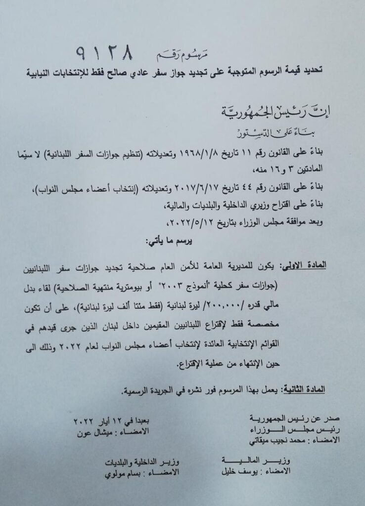 بعد إصرار من وزير الداخلية والبلديات بسام مولوي وافق مجلس الوزراء، على “تجديد جوازات السفر منتهية الصلاحية للمشاركة في الانتخابات النيابية فقط، مقابل بدل 200 ألف ليرة”.