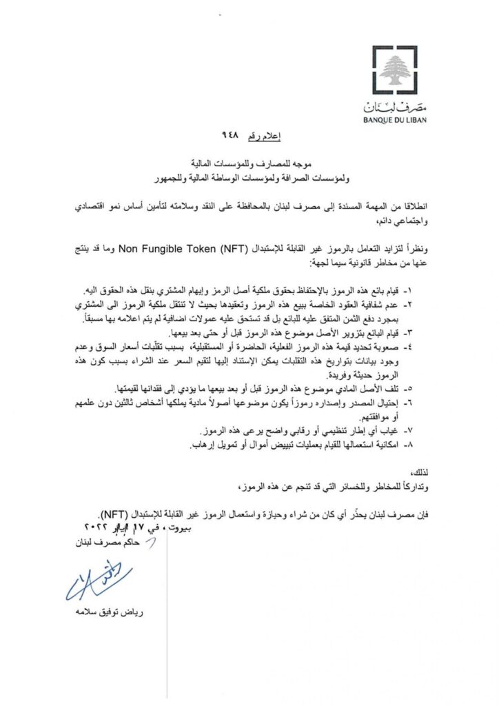 حذّر مصرف لبنان المواطنين من شراء وحيازة واستعمال الرموز غير القابلة للاستبدال (NFT) تداركاً للمخاطر وللخسائر التي قد تنجم عنها.