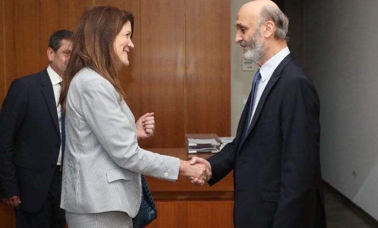 التقى رئيس حزب “القوّات اللبنانيّة” سمير جعجع، في المقر العام للحزب في معراب، سفيرة الولايات المتحدة الأميركيّة في لبنان دوروثي شيا، في حضور رئيس جهاز العلاقات الخارجيّة في الحزب الوزير السابق الدكتور ريشار قيومجيان ومستشار الرئيس للشؤون الخارجية مارك سعد.