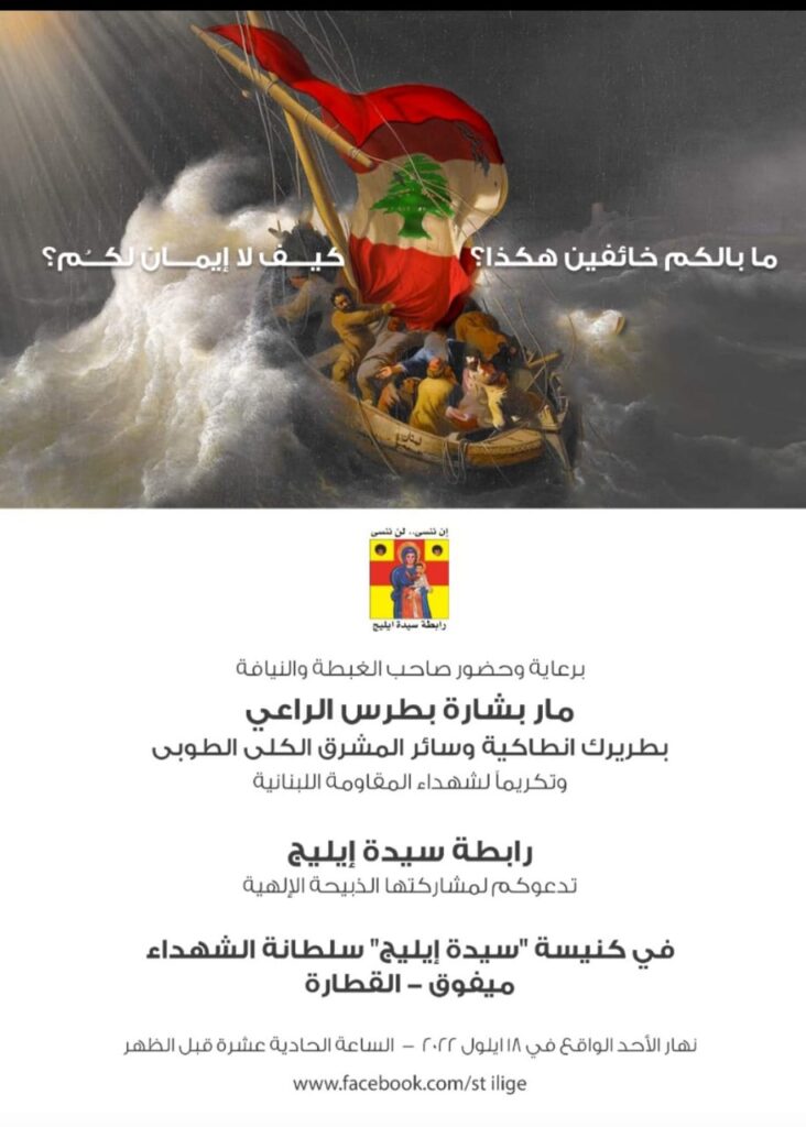 يترأس البطريرك الماروني مار بشارة بطرس الراعي القداس السنوي لراحة انفس شهداء المقاومة اللبنانية الذي تقيمه رابطة سيدة ايليج يوم الاحد المقبل 18 ايلول الساعة 11:00 قبل الظهر في المقر البطريركي في كنيسة سيدة ايليج ميفوق_ القطارة.