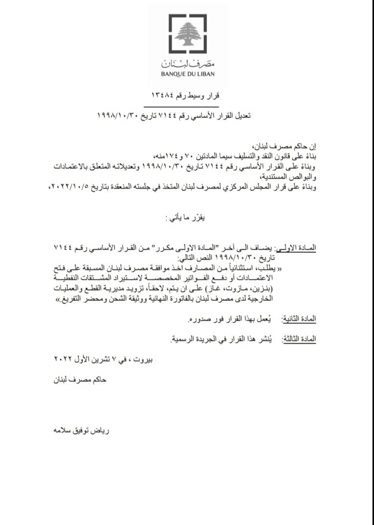 تعميم لمصرف لبنان بشأن استيراد المحروقات