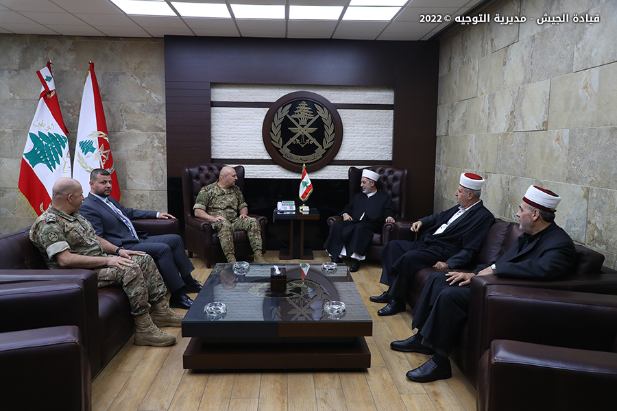 استقبل قائد الجيش العماد جوزاف عون في مكتبه في اليرزة، رئيس المجلس الإسلامي العلوي في لبنان الشيخ محمد عصفور على رأس وفد مرافق بحضور النائب فراس السلوم، وتناول البحث الأوضاع العامة في لبنان.