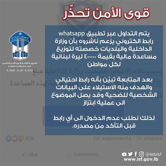 حذّرت قوى الأمن الداخلي عبر حسابها على “تويتر”، من رابط احتياليّ.