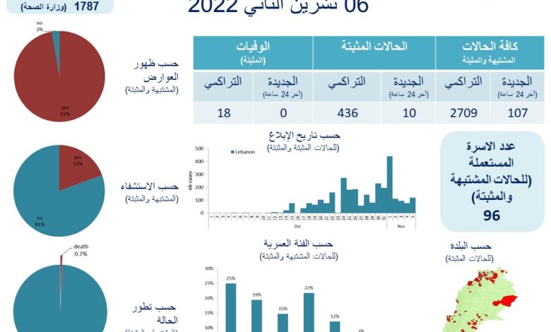 افادت وزارة الصحة في لبنان عن تسجيل ١٠ إصابات جديدة بكوليرا في لليوم الاحد ٦ تشرين الثاني ٢٠٢٢.
