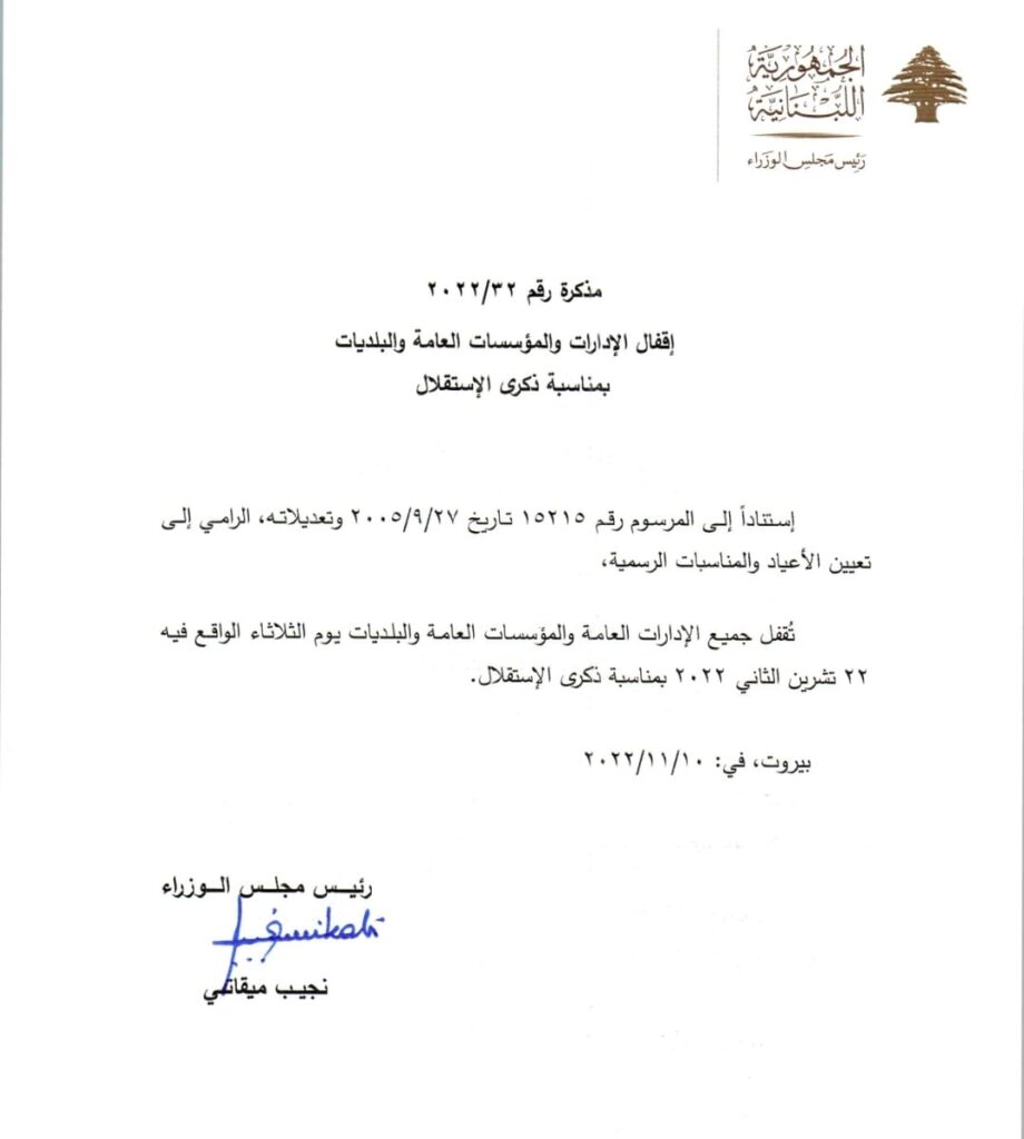 وجاء في نصّ المذكرة: إستناداً إلى المرسوم رقم 15215 تاريخ 27/9/2005 وتعديلاته، الرامي إلى تعيين الأعياد والمناسبات الرسمية، تُقفل جميع الإدارات العامة والمؤسسات العامة والبلديات يوم الثلاثاء الواقـع فيه 22 تشرين الثاني 2022 بمناسبة ذكرى الإستقلال”.