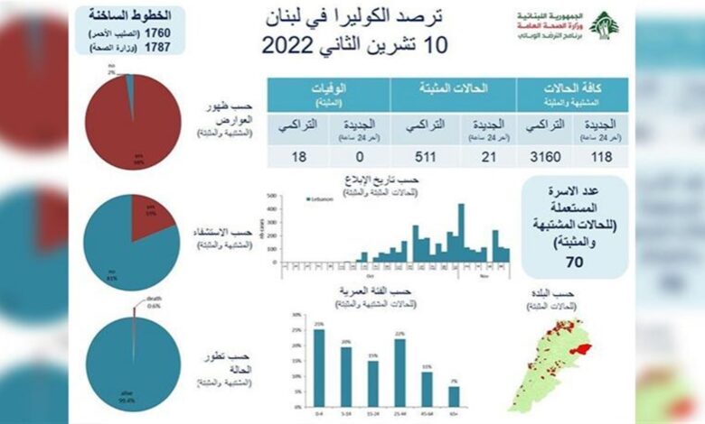 اعلنت وزارة الصحة العامة في تقرير نشرته مساء اليوم عن حالات الكوليرا في لبنان تسجيل “21 إصابة جديدة رفعت العدد التراكمي إلى511، فيما لم يتم تسجيل اي حالة وفاة وسجل العدد التراكمي للوفيات 18”.