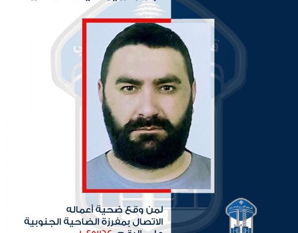 لذلك، تُعمِّم المديرية العامة لقوى الأمن الداخلي بناءً على إشارة القضاء المختص صورة (ح. م.)، وتطلب من الذين وقعوا ضحية أعماله الحضور إلى مركز المفرزة المذكورة الكائن في الاوزاعي ــ ثكنة الشهيد مصطفى علي حسن، أو الاتصال على الرقم: 451162/01، تمهيداً لاتخاذ الإجراءات القانونية اللازمة.