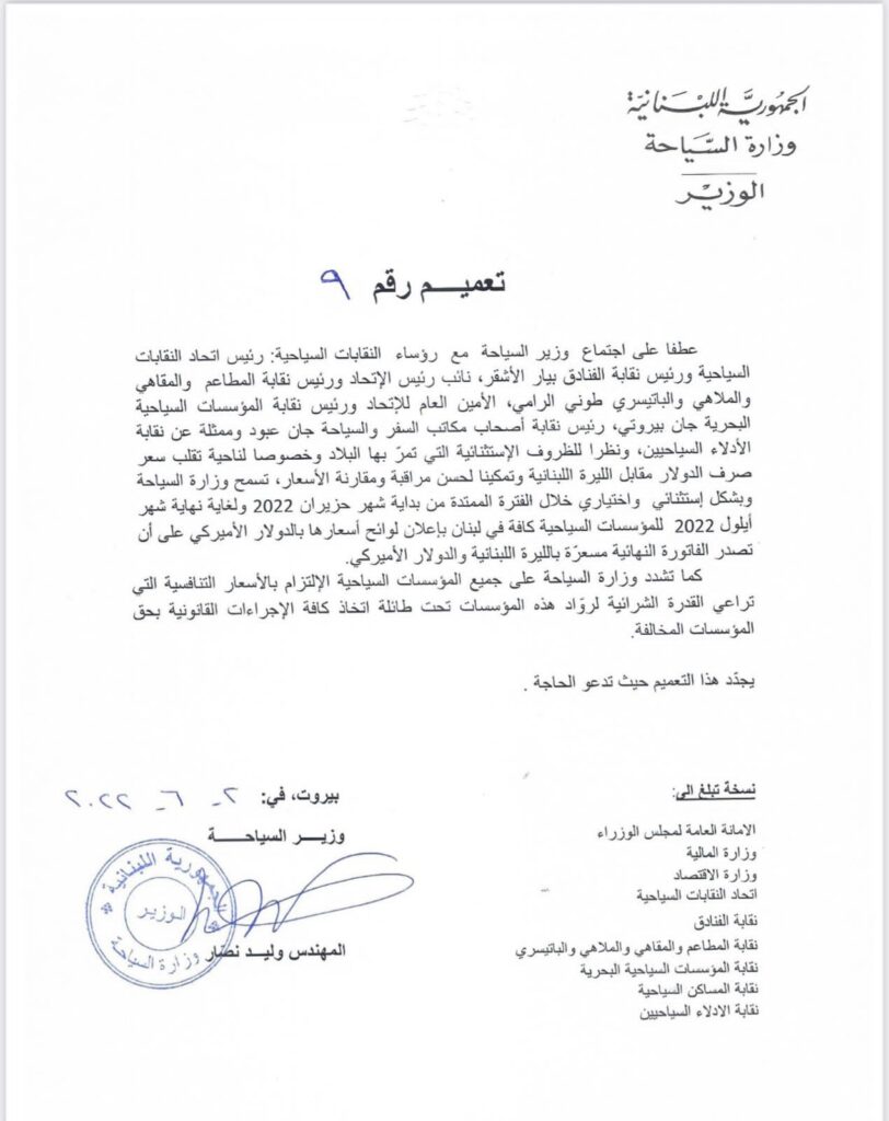 أعلنت وزارة السياحة في بيان “تمديد العمل بالتعميم رقم 9 تاريخ 2/6/2022 المتعلق بالسماح الاختياري للمؤسسات السياحية الإعلان عن لوائح أسعارها بالدولار الأميركي على أن تصدر الفاتورة النهائية بالليرة اللبنانية والدولار الأميركي وذلك حتى إشعار آخر”.