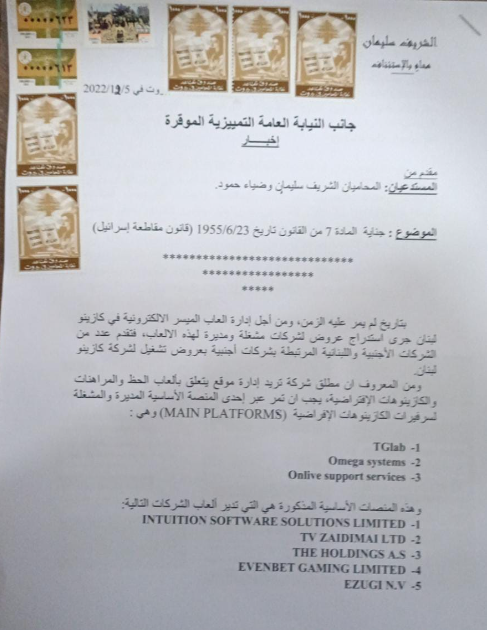 علمت “الجديد” أن المحاميان الشريف سليمان وضياء حمود تقدما باخبار إلى النيابة العامة التمييزية حول “انتهاك قانون مقاطعة اسرائيل من قبل شركة كازينو لبنان”، احيل إلى مفوض الحكومة لدى المحكمة العسكرية وفقا للاختصاص.