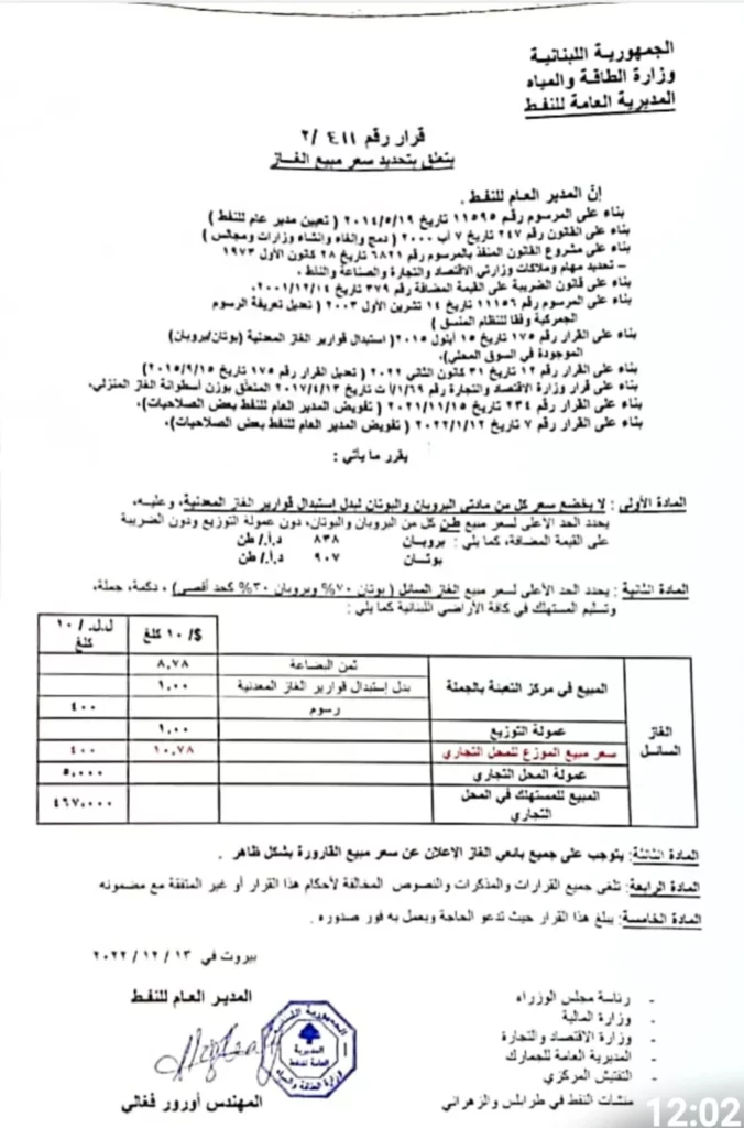 أصدرت وزارة الطاقة والمياه اليوم الثلاثاء جدولاً جديداً لتركيب أسعار المحروقات.
