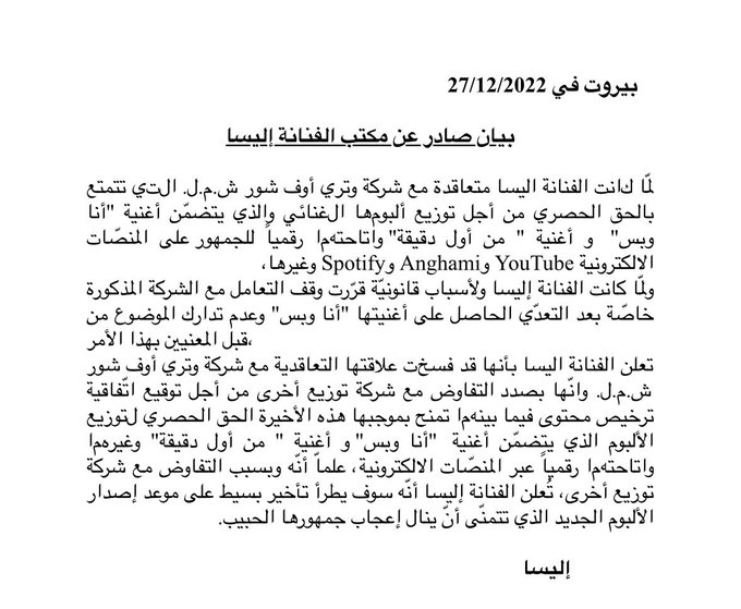 أعلنت الفنانة إليسا، في بيان صادر عن مكتبها، أنها قررت فسخ علاقتها التعاقدية مع شركة “وتري أوف شور ش.م.ل” وذلك بعد التعدي الذي طال أغنيتها “أنا وبس” وعدم تدارك الموضوع من قبل المعنيين بهذا الأمر.