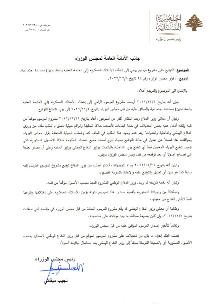 هذا ما طلبه رئيس حكومة تصريف الاعمال نجيب ميقاتي من الامانة العامة لمجلس الوزراء في ما خص مرسوم المساعدة الاجتماعية للعسكريين