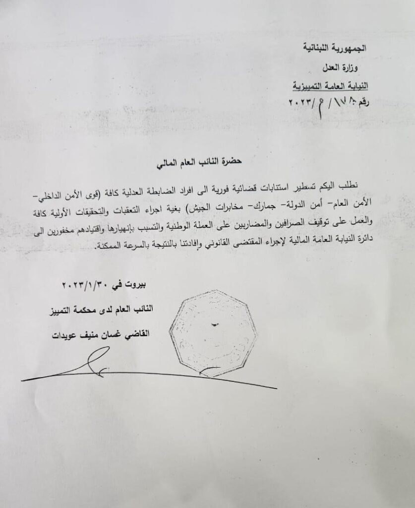 وجّه مدعي عام التمييز القاضي غسان عويدات كتابًا إلى النائب العام المالي القاضي علي إبراهيم، طلب فيه “تسطير استنابات قضائيّة فوريّة إلى أفراد الضابطة العدلية كافة (قوى الأمن الداخلي- الأمن العام -أمن الدولة -جمارك -مخابرات الجيش)، وذلك بغية إجراء التعقبّات والتحقيقات الأولية كافة والعمل على توقيف الصرافين والمضاربين على العملة الوطنية والتسبّب بانهيارها واقتيادهم مخفورين إلى دائرة النيابة العامة المالية لإجراء المقتضى القانوني وإفادتنا بالنتيجة بالسرعة الممكنة”.