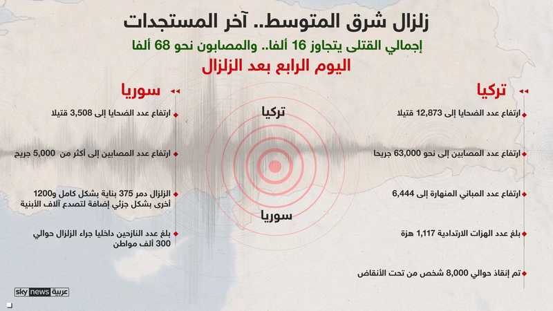 تفصيلا، قال مسؤولون إن 12,873 شخصا لقوا مصرعهم في تركيا و3,508 في سوريا جراء الزلزال الذي ضرب في وقت مبكر الاثنين وبلغت قوته 7,8 درجات، ما يرفع الحصيلة الإجمالية للقتلى إلى نحو 16,400.