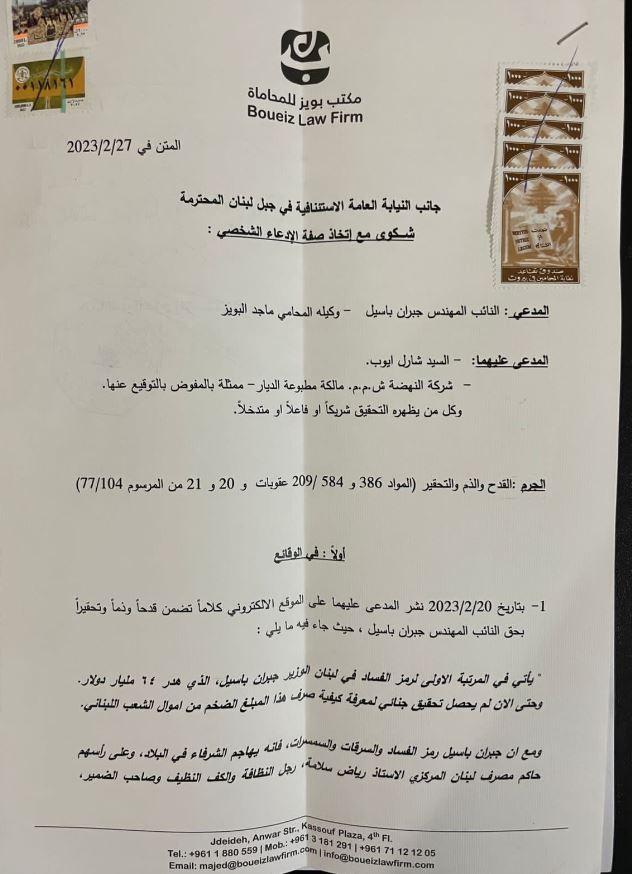 تقدم رئيس التيار الوطني الحر النائب جبران باسيل, اليوم الإثنين, عبر وكيله القانوني ماجد بويز، بإدعاء ضد رئيس تحرير صحيفة “الديار” الصحافي شارل أيوب، بجرم “القدح والذم والتحقير”.