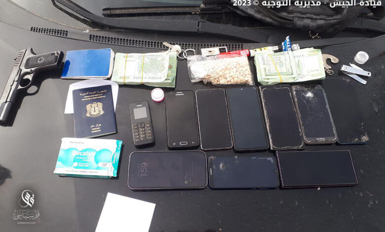 كما ضُبط داخل الجيب كمية من حبوب الكبتاغون والكوكايين ومبلغ مالي مزور ومسدس حربي.