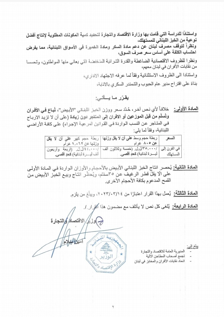 حددت وزارة الاقتصاد والتجارة سعر الخبز كالآتي: