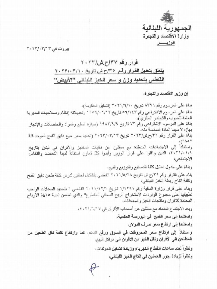 ربطة الخبز المتوسطة ٨٠٥ غراما بـ ٣٥٠٠٠ ليرة.