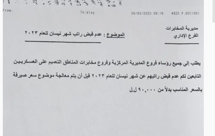 صدر اليوم الخميس تعميمٍ من مديرية مخابرات الجيش يطلب من رؤساء فروع المديرية المركزية وفروع مخابرات المناطق التعميم على العسكريين التابعين لهم عدم قبض رواتبهم عن شهر نيسان للعام 2023 قبل أن يتمّ معالجة موضوع سعر “صيرفة” بالسعر المناسب بدلاً من 90 ألف ليرة لبنانية.