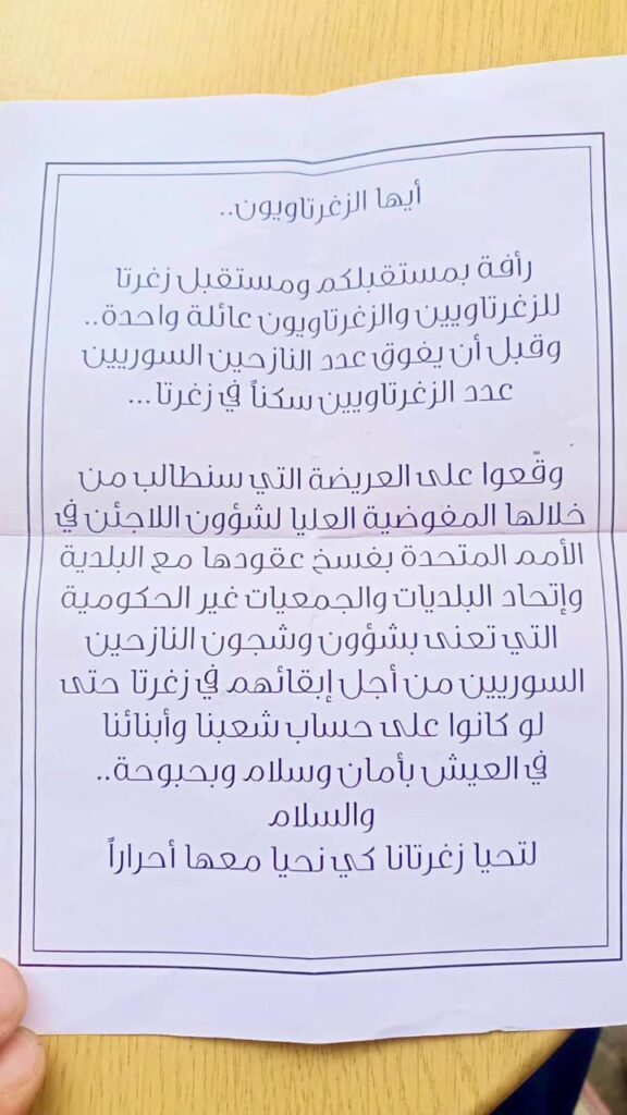 وقّعوا على العريضة التي سنطالب من خلالها المفوضية العليا لشؤون اللاجئين في الامم المتحدة بفسخ عقودها مع البلدية واتحاد البلديات والجمعيات غير الحكومية التي تعنى بشؤون وشجون النازحين السوريين من اجل ابقائهم في زغرتا حتى لو كانوا على حساب شعبنا وابنائنا في العيش بامان وسلام وبحبوحة…