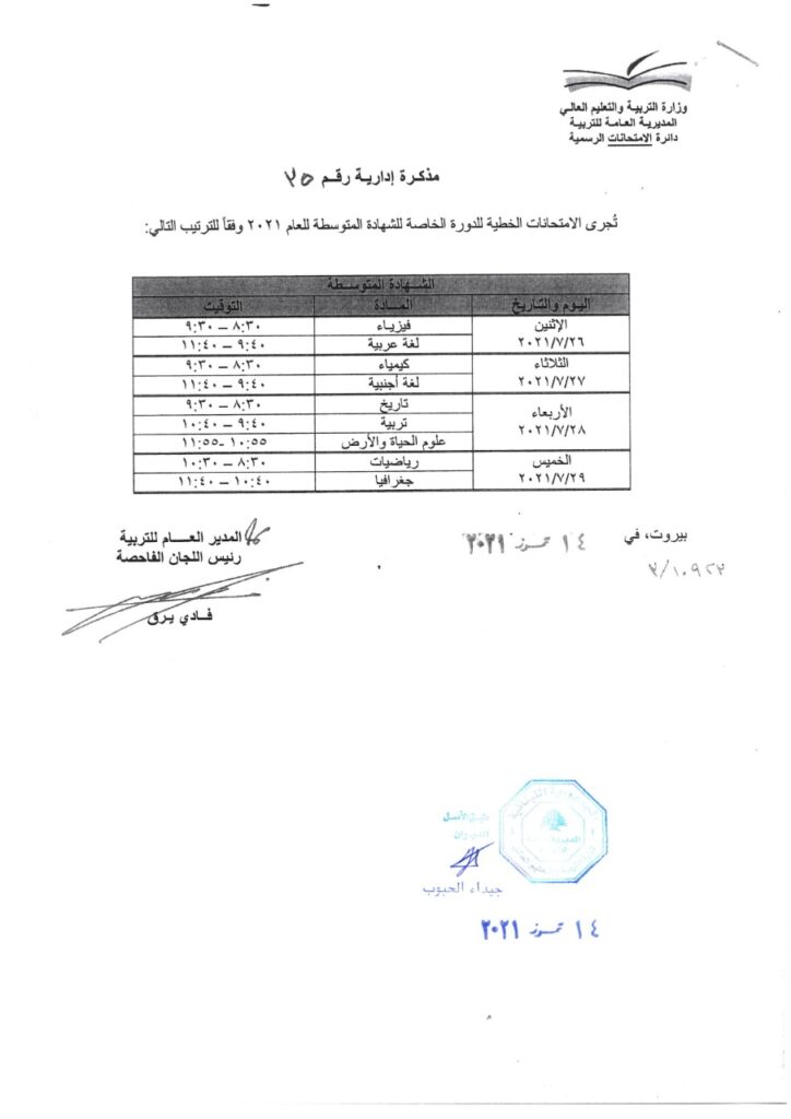 أصدر المدير العام للتربية رئيس اللجان الفاحصة الأستاذ فادي يرق المذكرة رقم 35 حول تحديد برنامج امتحانات الشهادة المتوسطة لمرشحي الطلبات الحرّة.