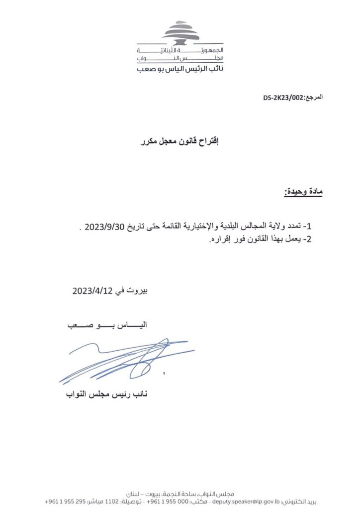 تقدّم نائب رئيس مجلس النواب الياس بو صعب باقتراح قانون معجّل مكرّر، يقضي بتمديد ولاية المجالس البلدية والاختيارية القائمة حتى تاريخ 30-9-2023.
